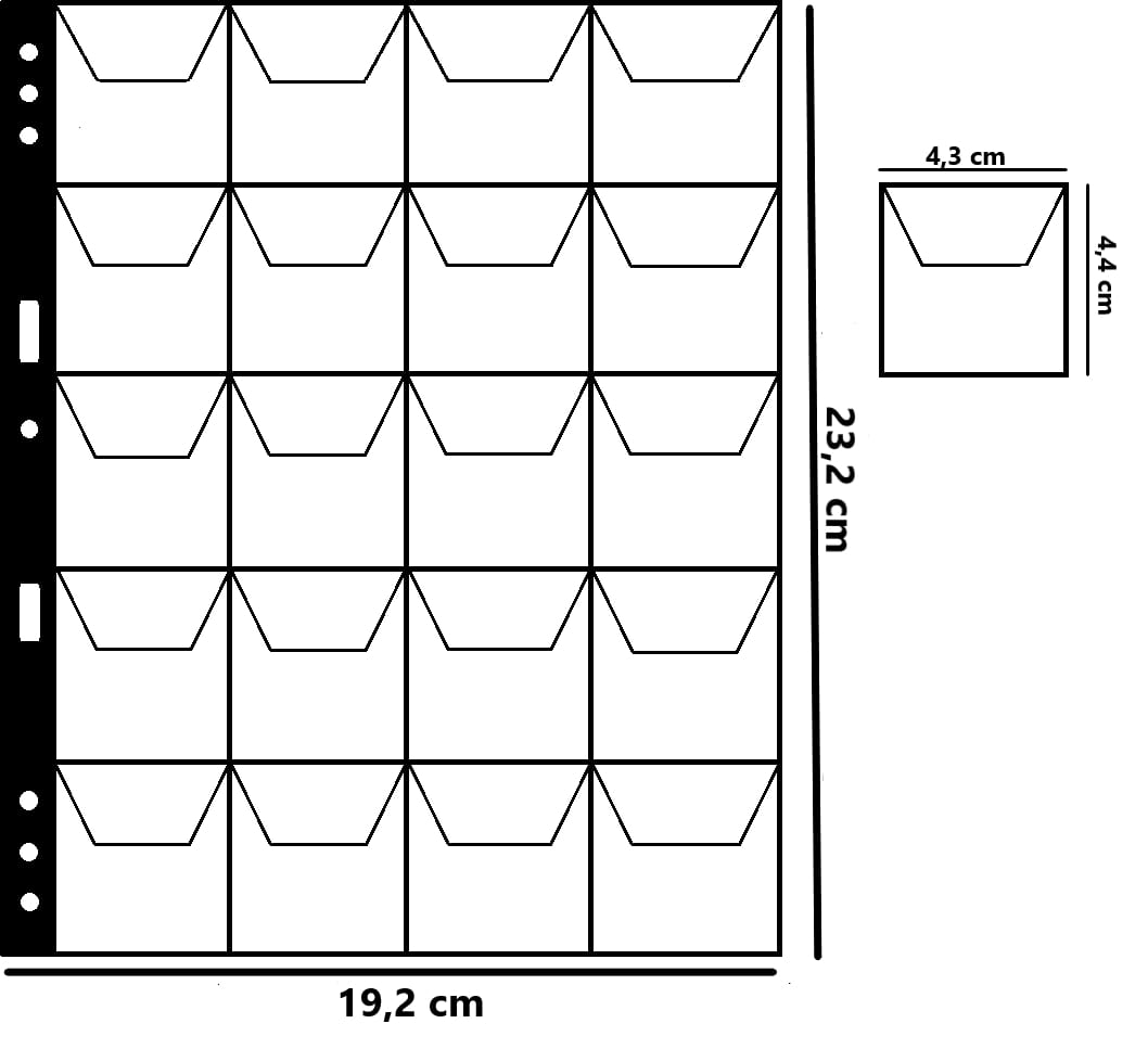 Descrizione: Confezione contenente 5 fogli per monete, ciascuno suddiviso in 20 caselle e dotato di un bordo nero rinforzato. Le dimensioni di ciascun foglio sono 18,5 cm di larghezza e 22,5 cm di altezza.